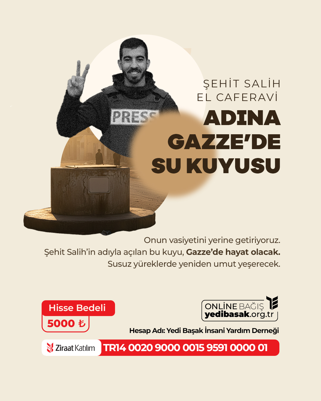 7 Ekim öncesi ve sonrası Gazze Şeridi’nde insani yardım çalışmalarını sürdüren Yedi Başak İnsani Yardım Derneği, şehit gazeteci Salih El Caferavi’nin adını yaşatmak için Gazze’nin Han Yunus kentinde yeni bir su kuyusu projesi başlatıyor. Proje, bölgede devam eden su krizine çözüm sunmayı ve yerinden edilmiş binlerce insanın yaşam koşullarını iyileştirmeyi amaçlıyor.