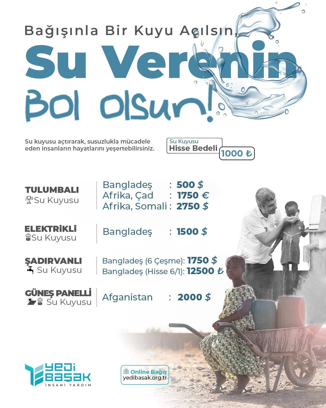 واحد من كل 10 أشخاص في العالم لا يحصل على الماء. يهدد الجفاف والفقر والنمو السكاني السريع والتلوث موارد مياه الشرب النظيفة. في عالمنا حيث بلايين البشر ليس لديهم مياه صحية ، تتزايد الأمراض الجماعية يومًا بعد يوم. إذا لم يتم اتخاذ تدابير جادة وممكنة للحد من موارد المياه النظيفة ، فإن الأخطار التي يواجهها الناس ستزداد أكثر. بصفتنا يدي باشاك ، نعمل على ضمان حصول ملايين الأشخاص حول العالم الذين يعانون من مشاكل نقص المياه على المياه النظيفة لتلبية كل احتياجاتهم. في بداية هذه الأعمال يتم فتح آبار المياه أو تخصص آبار المياه في مناطق الحاجة.